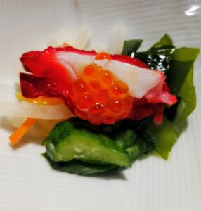 酢たこ、いくら醬油漬に柚子入り紅白なます、三陸わかめ、昆布締め胡瓜を合わせて新春のお通し 樽酒と共にご提供 #酢たこ #紅白なます #樽酒 #昭和歌謡動画が流れる店 #酒の肴 #喫煙可 #席でタバコが吸える居酒屋 #つき … Read more