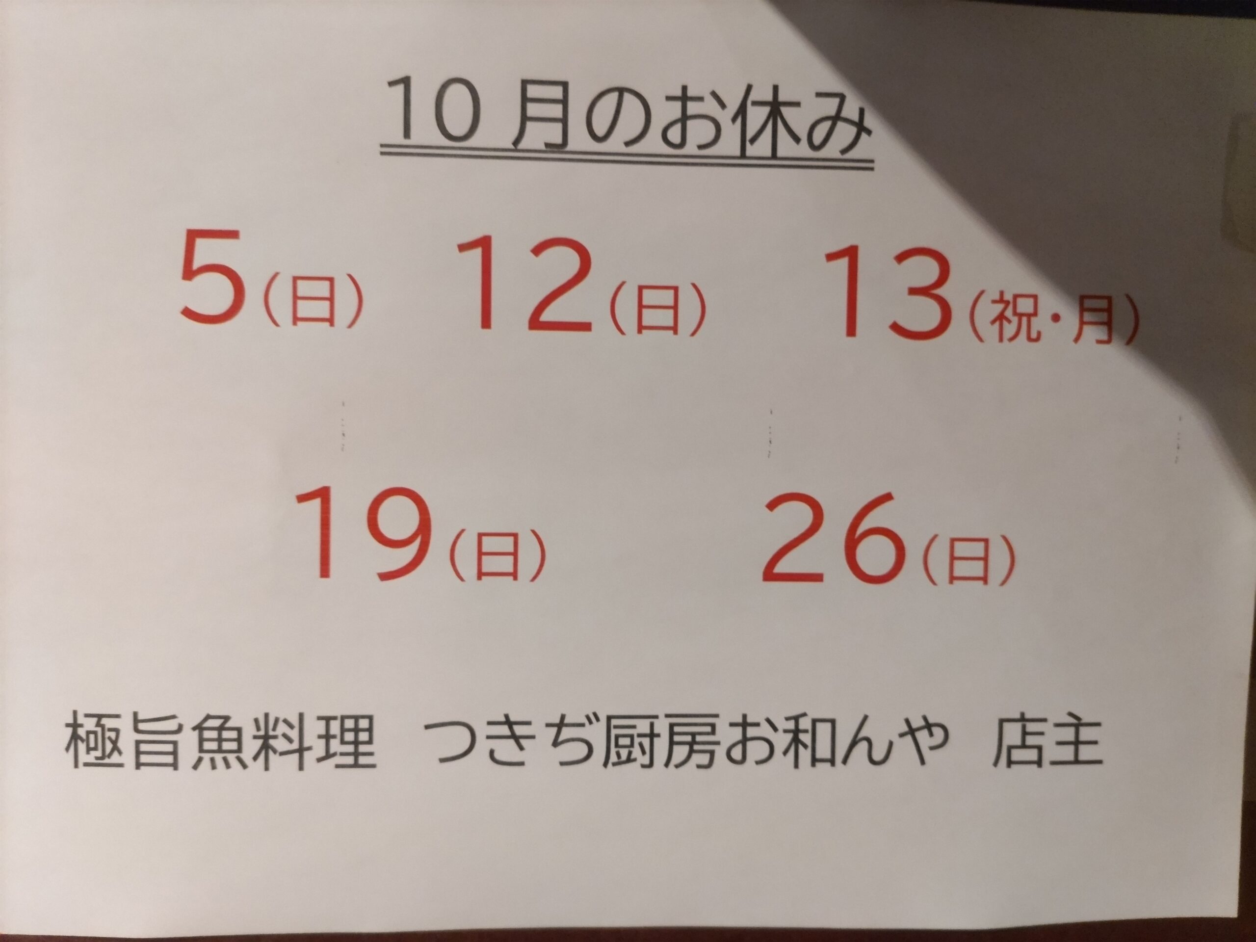#10月休業日 #秋を楽しみましょう #レストラン #昭和歌謡動画が流れる店 #酒の肴 #喫煙可 #席でタバコが吸える居酒屋 #つきぢ厨房お和んや #築地 #魚料理 #ど冷えもん #凍眠