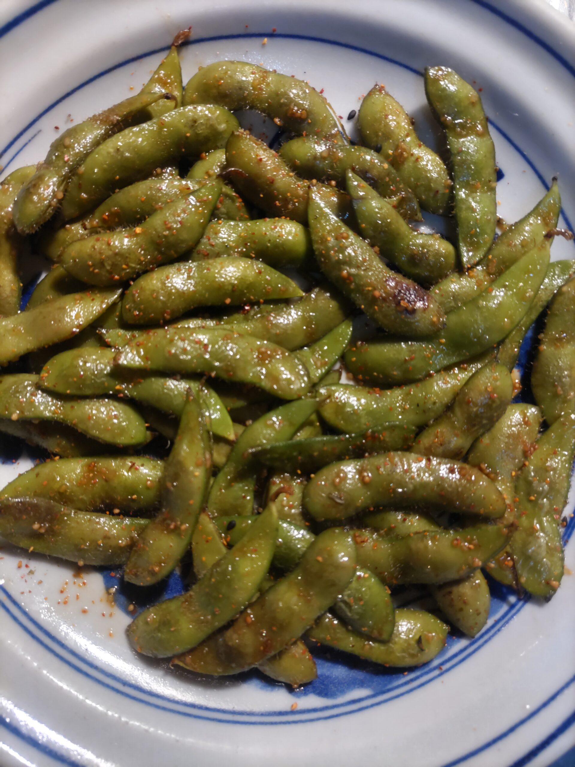 お酒の吸い込みの良いお客様ですが、おつまみはいつも軽めのものをご要望 そこで今回は「枝豆のガーリック七味焼」をご提供 硬めに茹でた枝豆をフライパンに移し、ごま油とガーリックで焼き付け仕上げに、醤油と七味で仕上げ 皮をしゃぶっているだけでも酒が進みます