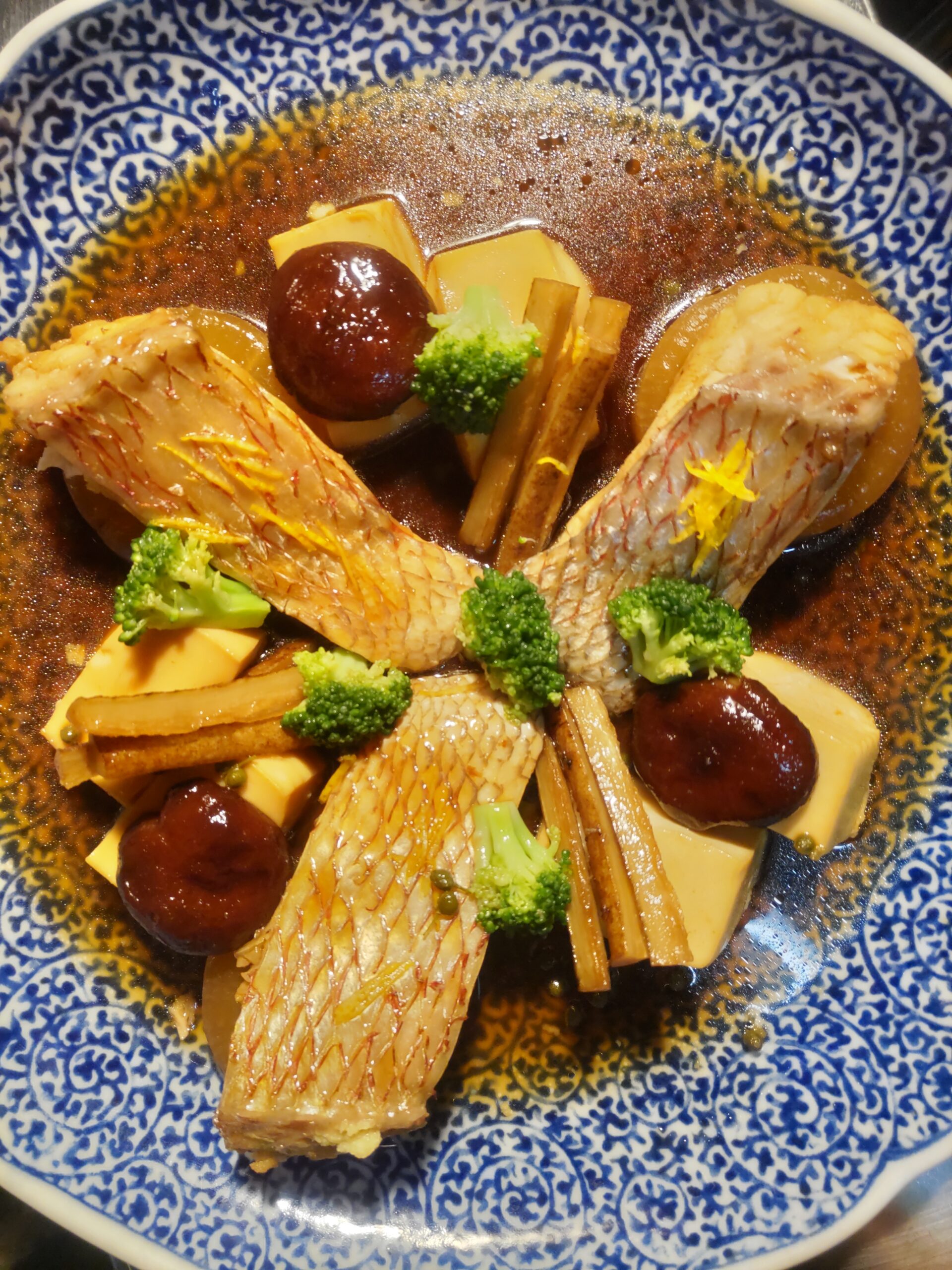 3名様で食べやすく召しあがれるような煮魚 同席の方は、少食なのでボリュームもそれなりにとのご要望 大きな活真鯛のハラスを切り身にして実山椒と共に煮付け 付け合わせの別炊き大根や豆腐も旨味をアップさせております