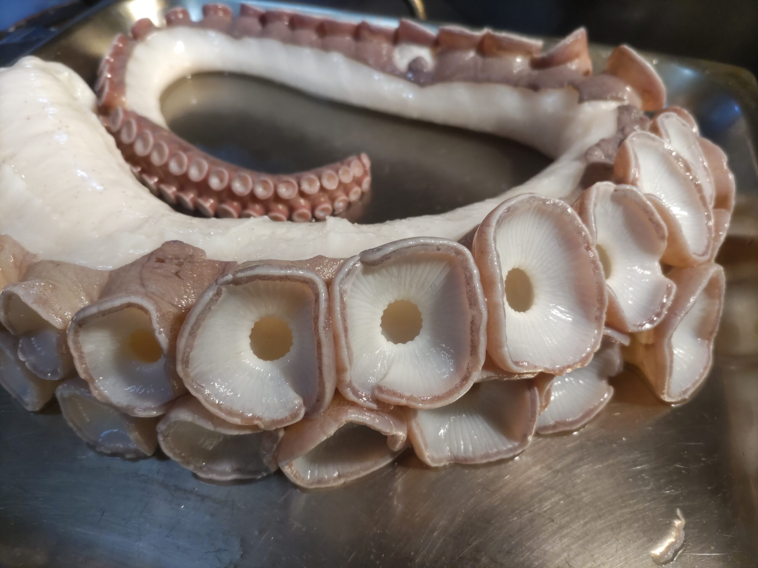 生きの良い太目のタコ足を仕入れ 少し醤油をいれた湯にて、霜降り 吸盤は刺身用に コリコリとした食感が心地よい、酒が進む逸品