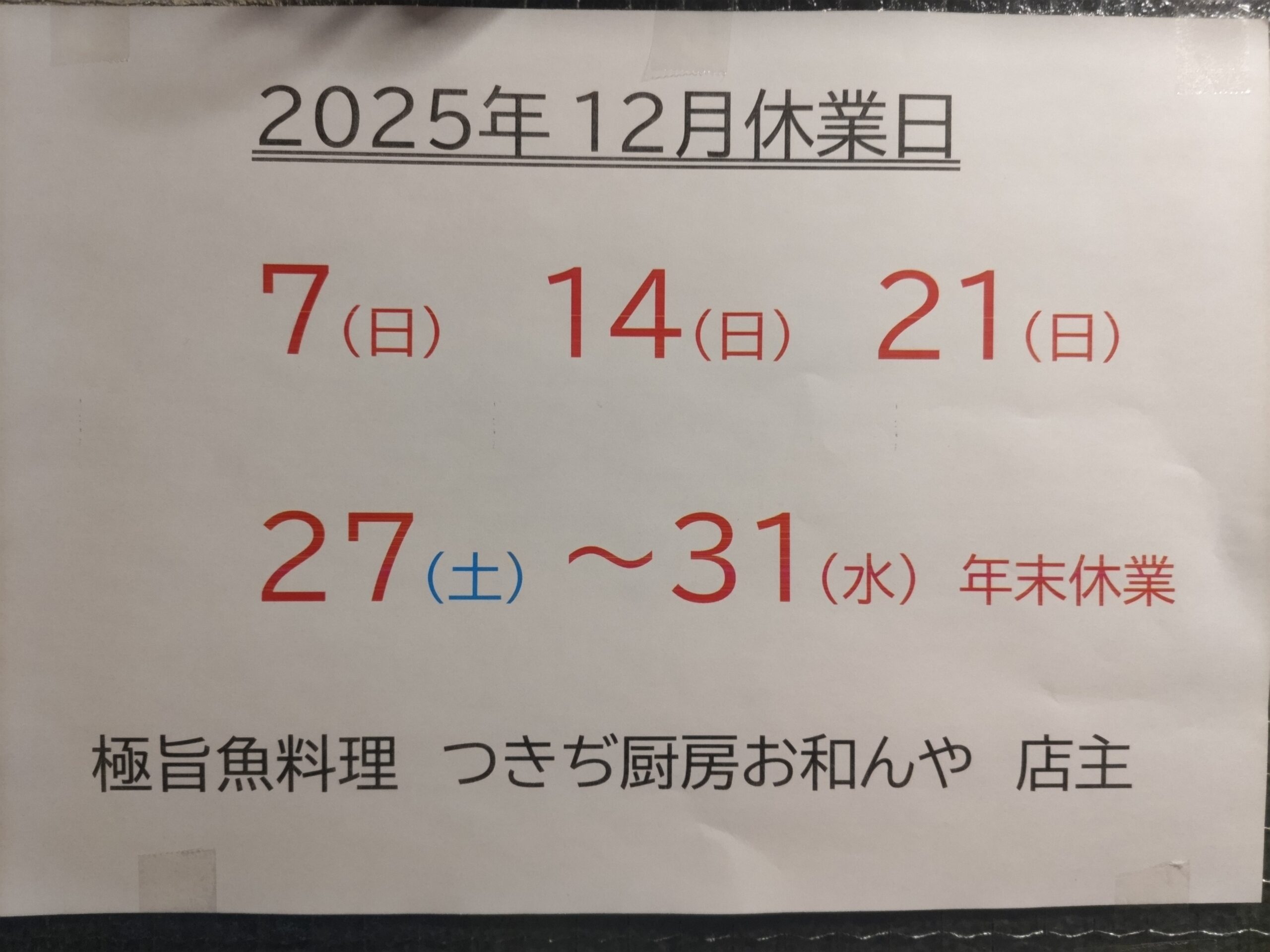 ※12月1日現在 ご予約満席日は12月2日(火)3日(水)6日(土)26日(金)