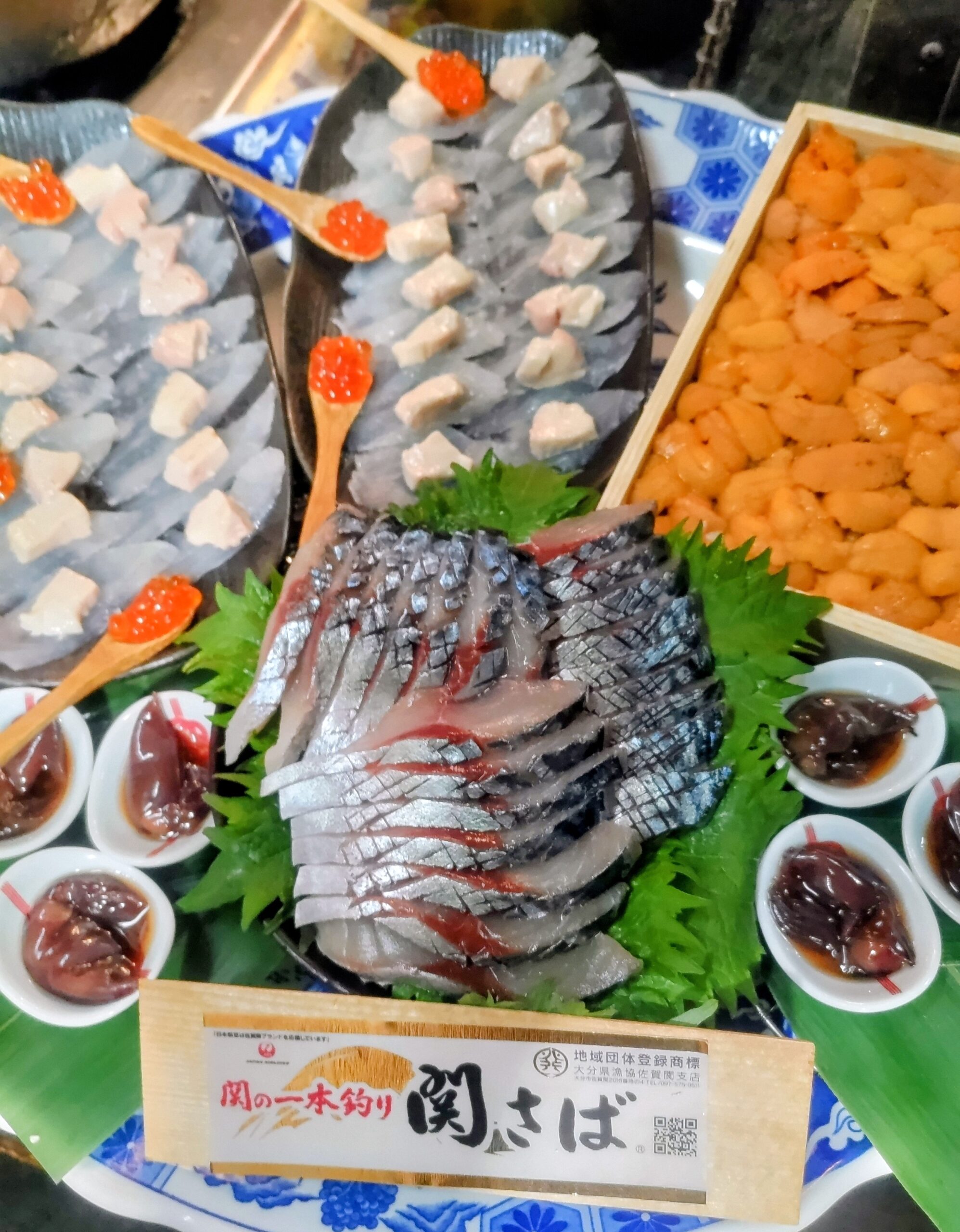 活かわはぎ大好きなお客様より、ご予約を頂きましたので、大分産のとびきり大きなものをご用意 箱バフンウニ、関サバと共にドーンと盛付け 師走らしい刺盛
