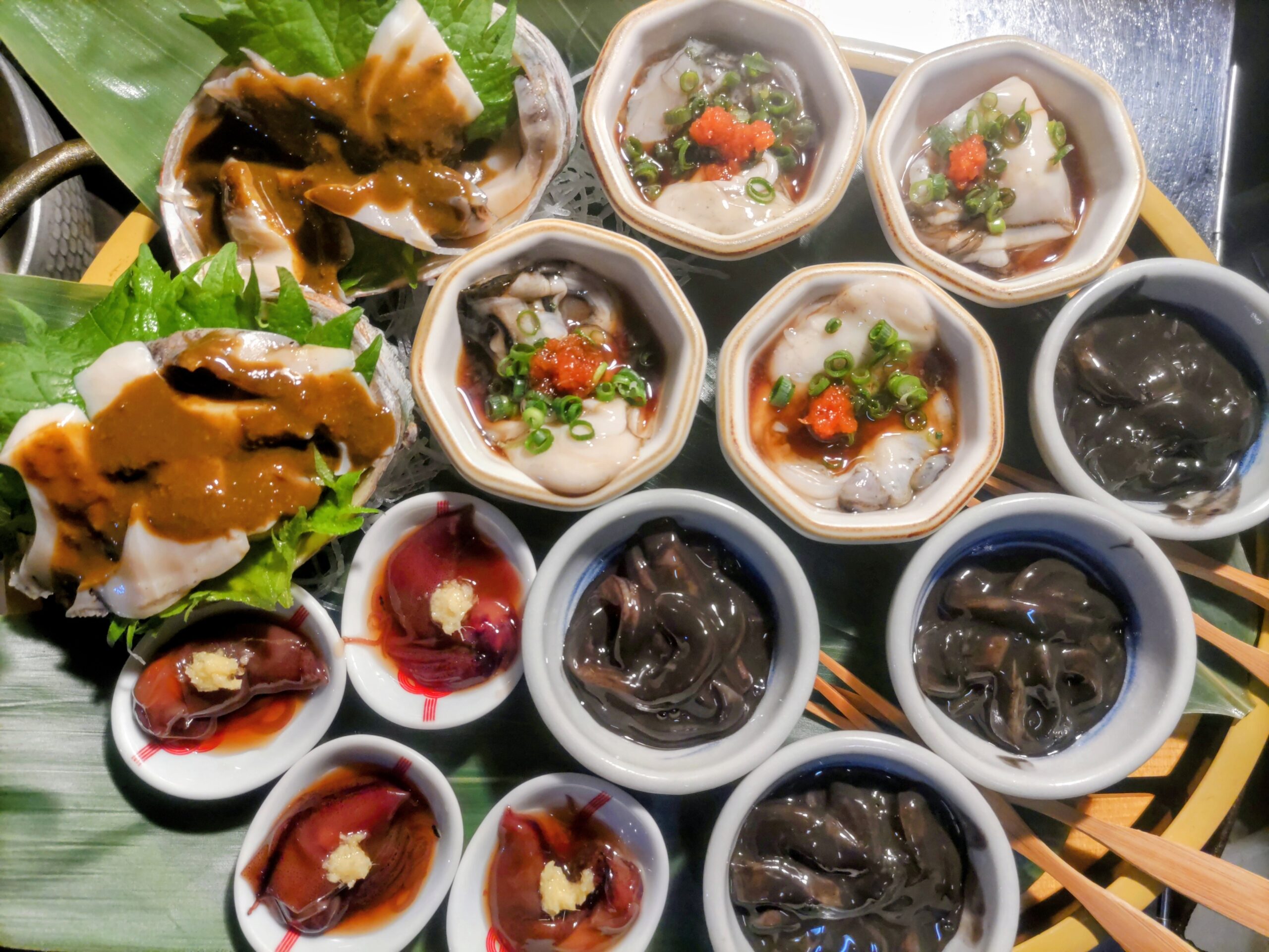 4名様のおまかせ料理 少量でいろいろ酒の進む一品をとのリクエストを受けて あわび肝和え刺、生牡蠣ポン酢かけ、自家製いか黒造り、ほたるいか沖漬 間違いなく日本酒が進む盛合せ ご提供の瞬間、「おっ…!」とのお声が