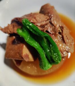 本鮪の脂身の多いトロの部位をゆっくりと炊き上げ、大根は、脂が強い鮪を炊いた出汁では無く、鰹と昆布でとった出汁にて含ませ煮にします ですので、鮪のトロと冬だいこんの炊き合わせです!