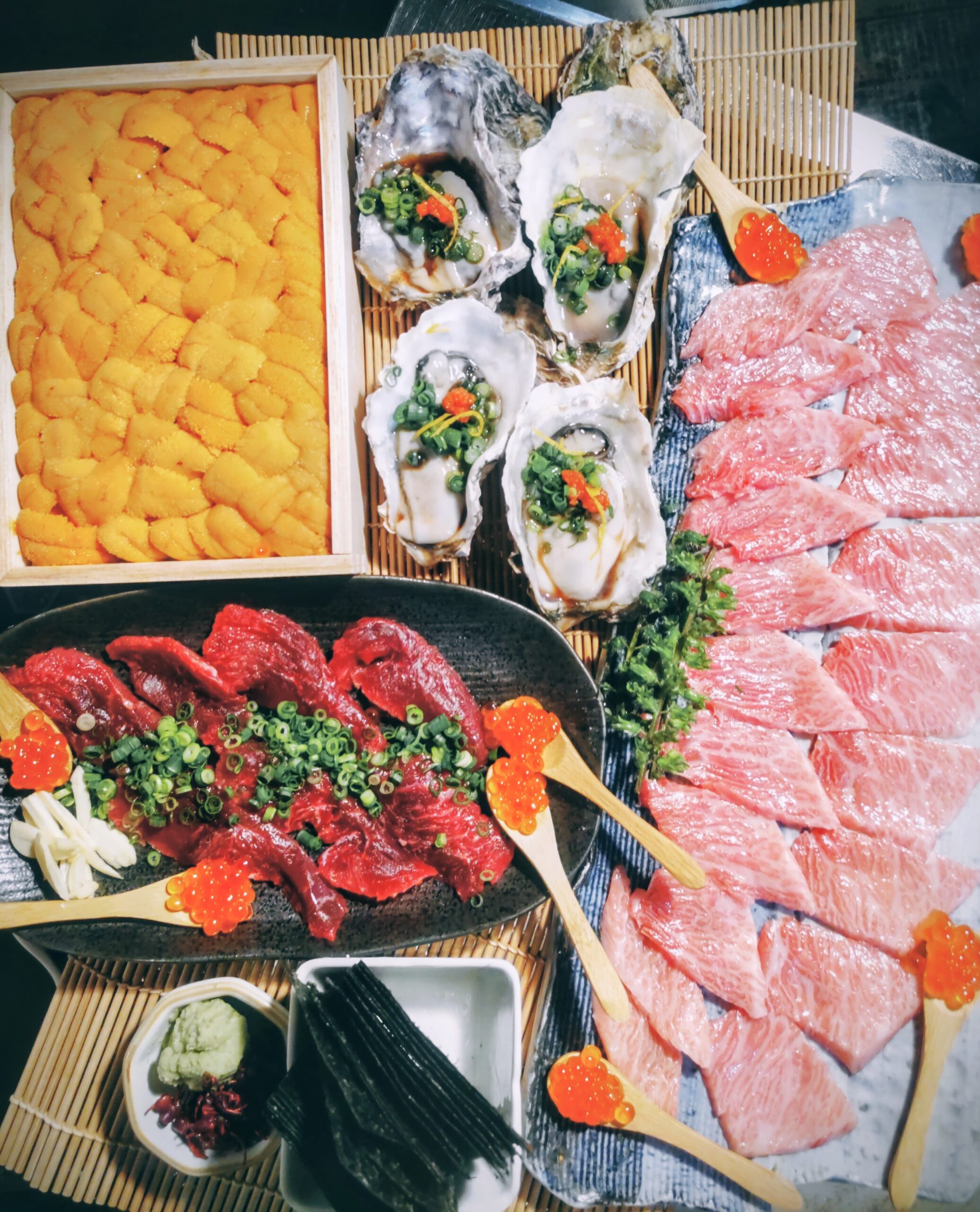 常連様よりアラカルトメニューをご希望のご予約を頂きました お刺身のオーダーを頂くことを予期して、少し目先を変えて準備を バフンウニと天然本鮪カマトロ刺身を中心に盛付け お客様が、ご自身で一口大の焼海苔にかまとろ刺と雲丹を乗せ、がり醤油で山葵醤油を付けてお召し上がり頂きます もちろん雲丹だけでもかまとろ刺だけでもイクラを乗せてもお好みでどうぞ こんな、食べ方したことがないと拍手喝采