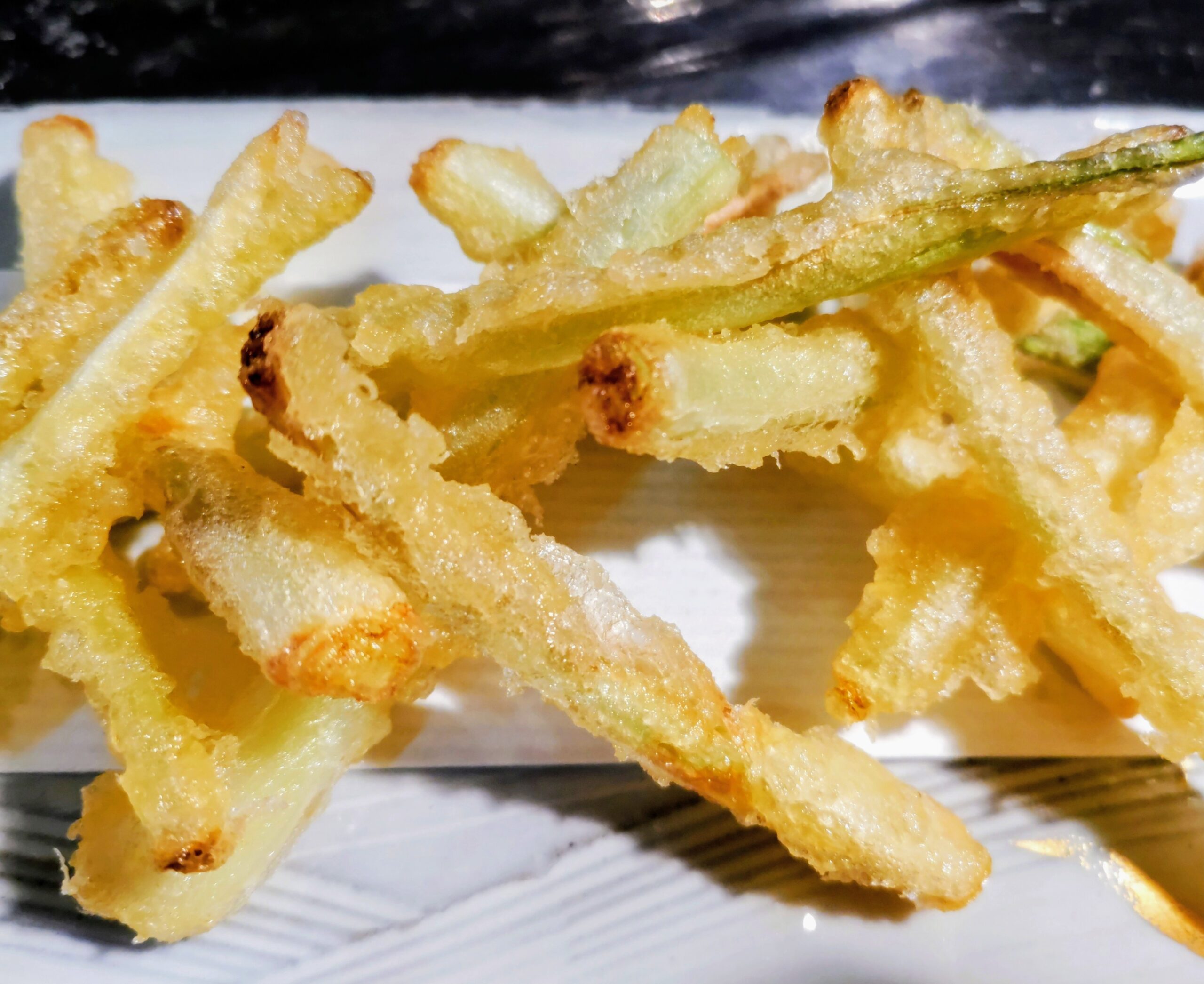 薄衣で揚げた島らっきょの天婦羅は、軽くて香り高いのが特徴で、いくらでも召し上がれますね 今日も一献