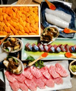 #雲丹と刺身を合わせて召し上がれ #刺身盛合せ #昭和歌謡動画が流れる店 #酒の肴 #喫煙可 #席でタバコが吸える居酒屋 #つきぢ厨房お和んや #築地 #魚料理