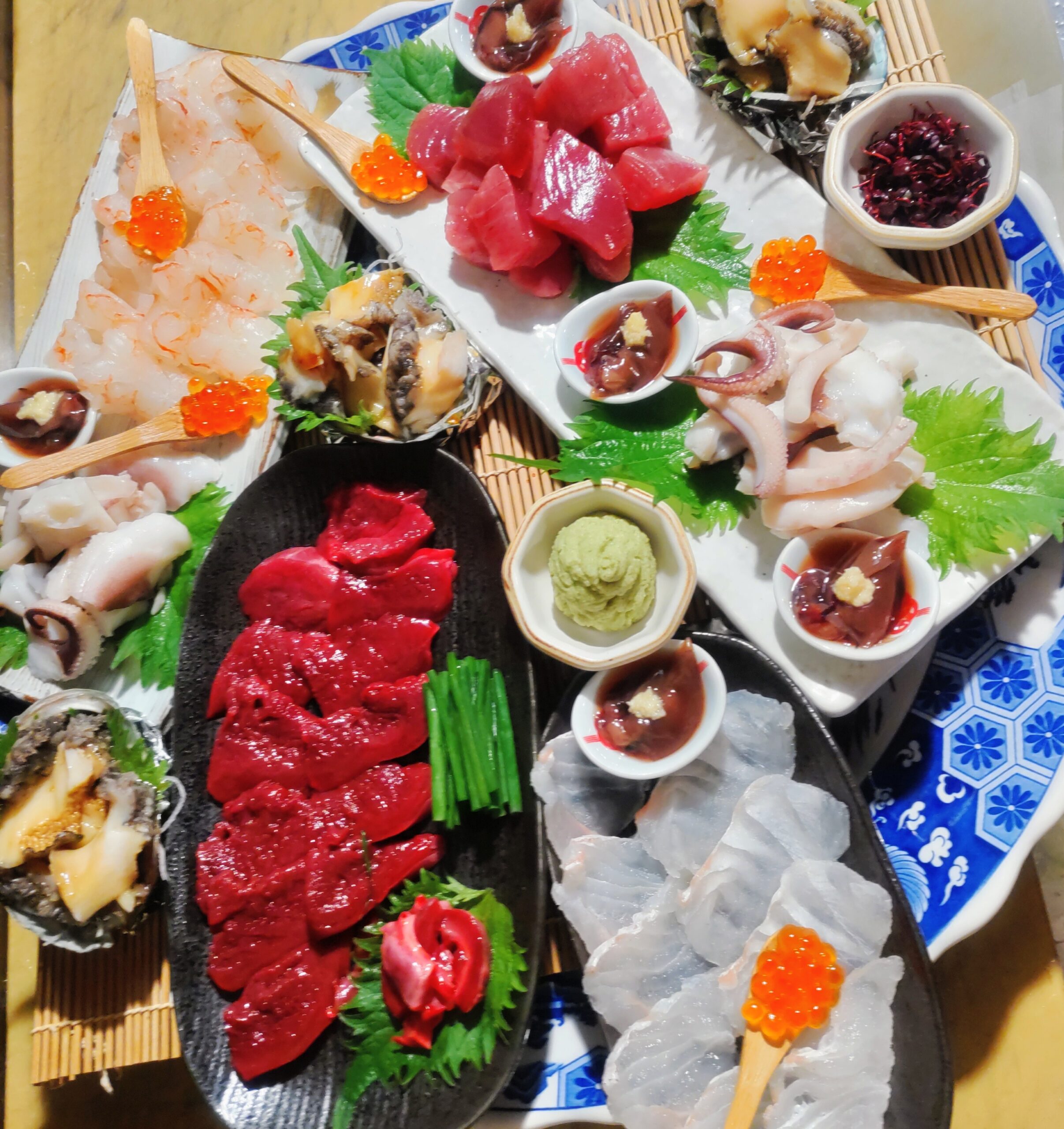 5名でご来店の常連様 おまかせ刺身を大皿でお願いとのご注文 鮑、本めじ鮪、モウカの星、天然ひらめ、赤えび、もんご烏賊げそ、蛍烏賊沖漬、いくら醬油漬の盛合せをご提供