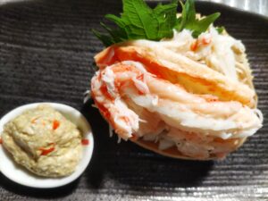 ずっしりと重い約1㎏サイズのズワイ蟹を仕入れ 蟹は、食べたいけれど酒飲みは、解すのが面倒なんだよねとのお声が多いので、すべてほぐし身にして甲羅盛にてご提供