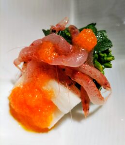 駿河湾でのみ水揚げされる生の桜エビ 漁は、春と秋の一定期間に限定されている貴重品です 菜の花、長芋とあわせてサラダ仕立てのお通しに